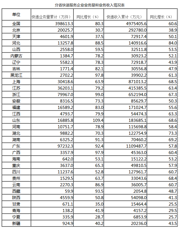1月,全國快遞服務企業業務量完成39.9億件,同比增長80.3%;業務收入完成497.5億元,同比增長60.6%。其中,同城業務量完成9.1億件,同比增長62.7%;異地業務量完成29.8億件,同比增長86.3%;國際/港澳臺業務量完成0.9億件,同比增長85%。