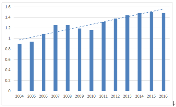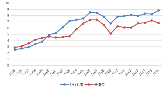 圖 2 洛杉磯港和長灘港集裝箱吞吐量增長情況(1995-2016年,百萬TEU)