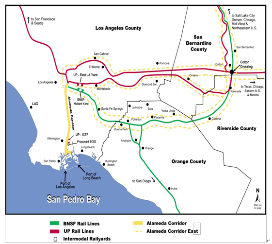 通過洛杉磯港和長灘港的貨物中超過60%分撥到美國內陸,阿拉米達貨運走廊承載內陸分撥貨物的比重超過50%,年收入超過1億美元。