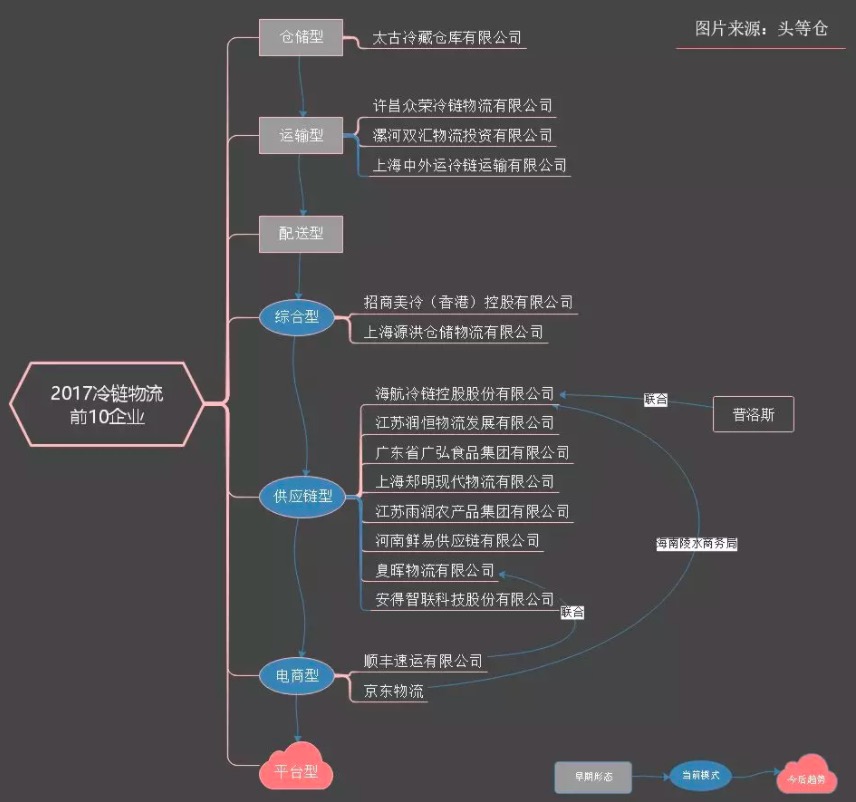 頭等倉整理了2017年冷鏈物流企業(yè)排名前15名以及”業(yè)余“專業(yè)級冷鏈玩家京東,并對應(yīng)分類如下: