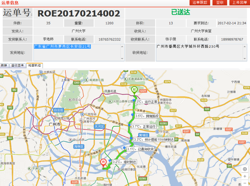 調線后,可給對應司機發送短信,也可以在手持終端接受該調線任務,并通過終端開始派送任務及簽收回單,全程記錄時間及位置信息并回傳系統,對運輸全程做溫度監控,見圖6.