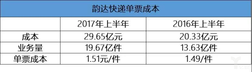 韻達在2017年上半年單票快遞產(chǎn)品成本從1.49元上升到1.51元。