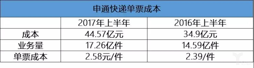 申通在2017年上半年單票快遞產(chǎn)品成本則從2.39元上升到2.58元,上升幅度為7.9%。