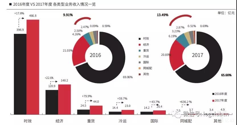 在新業(yè)務中,重貨運輸營收44.02億元,增長79.93%,占總營收比達6.19%。2017年同城配業(yè)務不含稅營業(yè)收入總計3.66億元,較上一年同期增長636.18%。冷運與醫(yī)藥業(yè)務也保持了高速發(fā)展,不含稅營業(yè)收入達22.95億,同比增長59.70%。國際業(yè)務凈收入20.43億元,較上年增長43.70%。