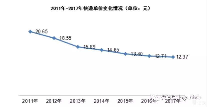 2017年全行業(yè)快遞均價為12.37元/票,較2016年下降0.34 元/票,降幅2.68%,快遞均價連續(xù)七年下滑。