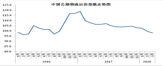 中國物流與采購聯(lián)合會(huì)發(fā)布的2018年3月份中國物流業(yè)景氣指數(shù)為53.4%,較上月回升3.4個(gè)百分點(diǎn);中國倉儲(chǔ)指數(shù)為53.5%,較上月回升5.1個(gè)百分點(diǎn);中國公路物流運(yùn)價(jià)指數(shù)為98.0點(diǎn),比上月回落1.5%。