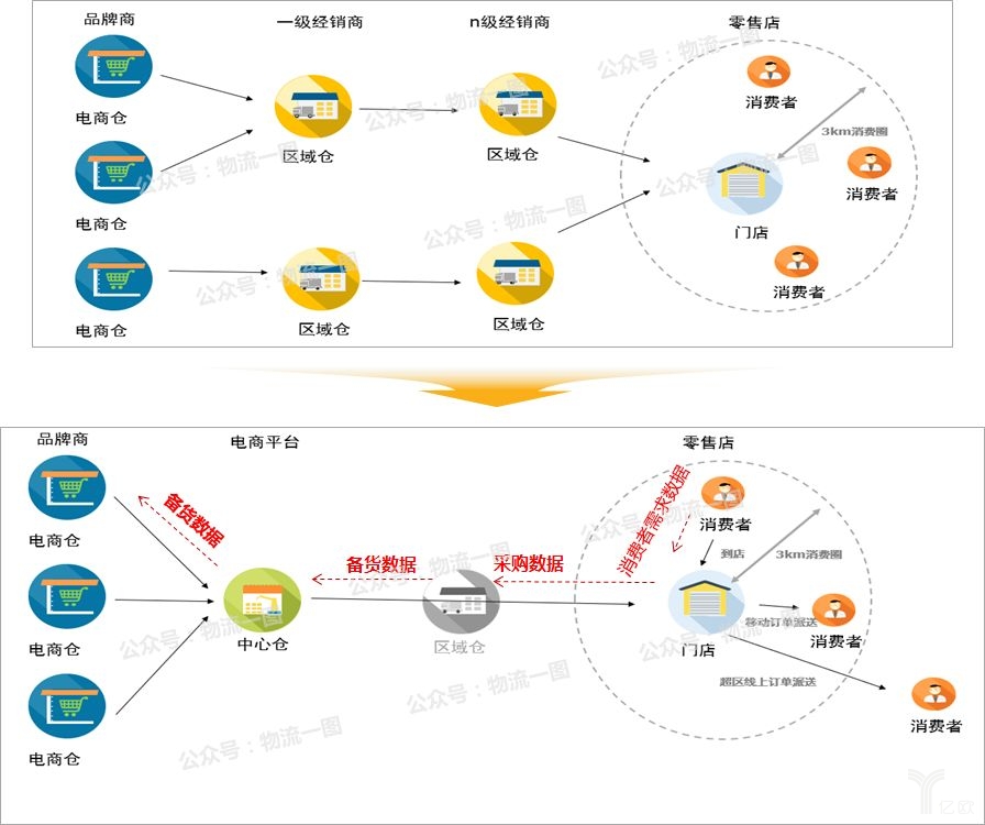 →傳統(tǒng)供應(yīng)鏈向新零售供應(yīng)鏈轉(zhuǎn)型示意圖: