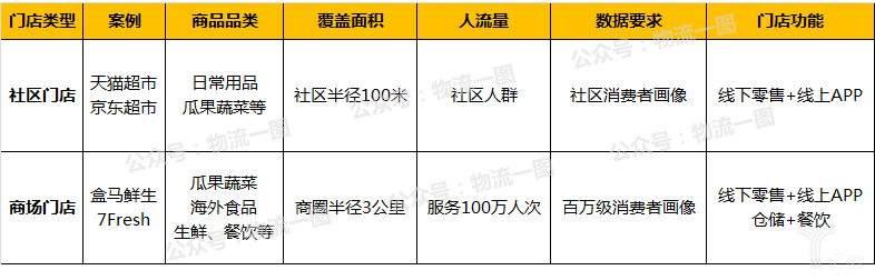 門店載體按輻射面積可分為社區(qū)門店和商圈門店,社區(qū)門店主要指小區(qū)內(nèi)零售商店(如京東便利店和天貓超市),而商圈門店指核心商業(yè)街、百貨大廈或大賣場內(nèi)的綜合門店(如盒馬鮮生和超級物種),兩種載體在店鋪面積、消費者覆蓋等方面有較大區(qū)別,這也直接決定了店內(nèi)SKU數(shù)量及功能區(qū)別,當(dāng)然對新零售線上線下能力要求也有較大區(qū)別,具體區(qū)別如下: