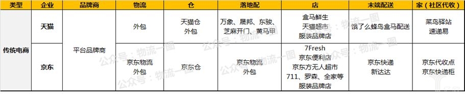 傳統(tǒng)電商企業(yè)資金流充足,各環(huán)節(jié)采用自建或收購的方式迅速補(bǔ)全,核心能力是技術(shù)和數(shù)據(jù)優(yōu)勢、宣傳能力、以及平臺供應(yīng)商資源。目前主要參與者為天貓和京東。兩者品牌商基本都是入駐平臺的品牌商,而物流環(huán)節(jié),天貓多采用整合,京東多為自建,另外雙方在門店到家環(huán)節(jié)的資源搶奪戰(zhàn)也火藥味十足: