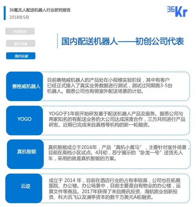 36氪經(jīng)過(guò)調(diào)研發(fā)現(xiàn),與國(guó)外相比,中國(guó)的無(wú)人配送機(jī)器人領(lǐng)域的商業(yè)嘗試和創(chuàng)業(yè)呈現(xiàn)出獨(dú)有的特點(diǎn):一是,與國(guó)外主要做室外場(chǎng)景不同,國(guó)內(nèi)初創(chuàng)公司室內(nèi)、室外場(chǎng)景并重,室內(nèi)無(wú)人配送成為中國(guó)特色;二是,國(guó)外做室外配送機(jī)器人的以初創(chuàng)公司為主,但國(guó)內(nèi)則以互聯(lián)網(wǎng)大公司為主。