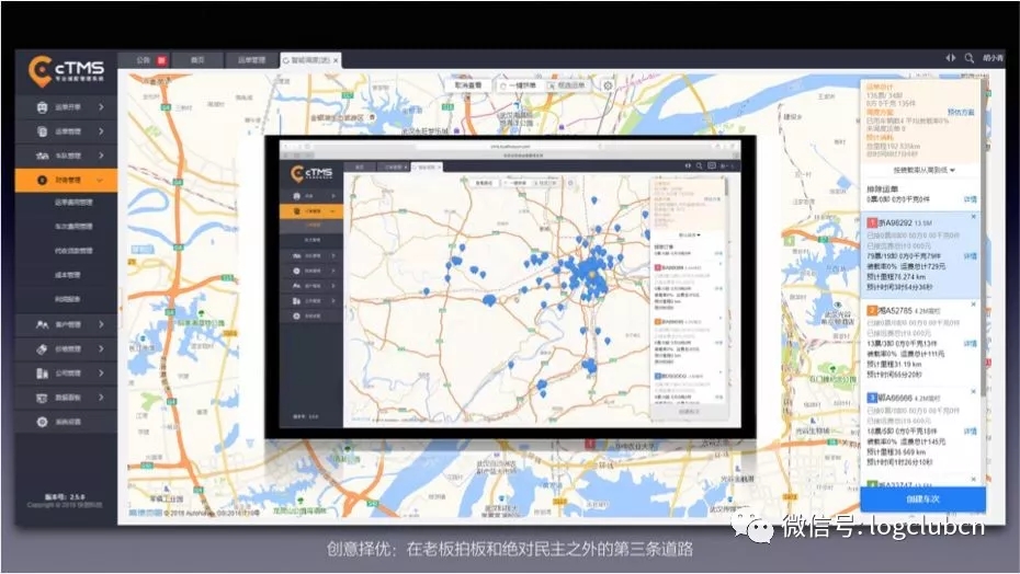 這個(gè)是大家很熟悉的“cTMS智能調(diào)度”界面。我們只要點(diǎn)一下,就能把需要配送的成千上萬(wàn)個(gè)地址隨機(jī)的訂單,自動(dòng)地匹配給合適的車輛,求出裝載率、配送線路上的最優(yōu)解,實(shí)現(xiàn)“十秒千單”的調(diào)度結(jié)果。