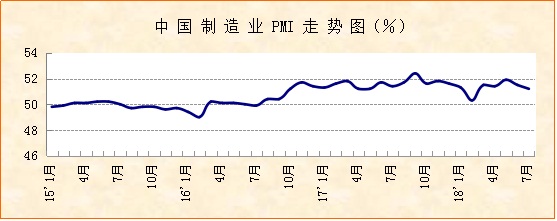 中國物流與采購聯合會、國家統計局服務業調查中心發布的2018年7月份中國制造業采購經理指數(PMI)為51.2%,較上月回落0.3個百分點,但仍保持在51%以上相對較高水平。綜合來看,經濟運行韌性較好。