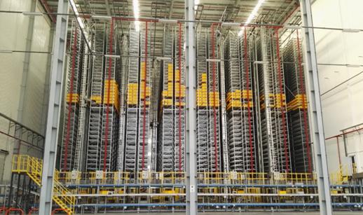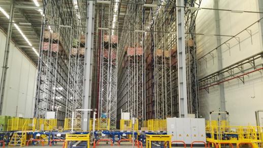 南京二期自動(dòng)托盤堆垛系統(tǒng)包含3個(gè)巷道共 10608個(gè)存儲(chǔ)位, 3臺(tái)高速自動(dòng)托盤堆垛機(jī),含雙深位載貨臺(tái),高度為22米雙深位存儲(chǔ)位,技術(shù)能力可達(dá)到雙循環(huán)90個(gè)托盤/小時(shí)(單循環(huán)可達(dá)到150托盤/小時(shí)左右)。傳統(tǒng)倉庫主要利用橫梁托盤貨架配合高位叉車,效率低下,ASRS托盤堆垛系統(tǒng)中每一臺(tái)堆垛機(jī)的效率是傳統(tǒng)倉庫高位叉車的4-5倍,而且不需要人員操作,準(zhǔn)確率高,人員成本接近為零。