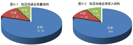 1-11月,東、中、西部地區(qū)快遞業(yè)務(wù)量比重分別為79.9%、12.2%和7.9%,業(yè)務(wù)收入比重分別為80%、11.2%和8.8%。與去年同期相比,東部地區(qū)快遞業(yè)務(wù)量比重下降了1.2個百分點,快遞業(yè)務(wù)收入比重下降了0.9個百分點;中部地區(qū)快遞業(yè)務(wù)量比重上升了0.6個百分點,快遞業(yè)務(wù)收入比重上升了0.4個百分點;西部地區(qū)快遞業(yè)務(wù)量比重上升了0.6個百分點,快遞業(yè)務(wù)收入比重上升了0.5個百分點。