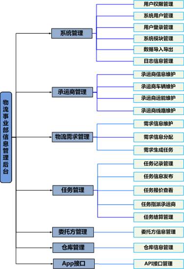 信息流管理平臺TMS模塊結構圖如下所示,分為承運商管理、運能信息、車輛管理、物流需求管理、任務記錄、承運商報價記錄、委托方管理、倉庫管理等部分: