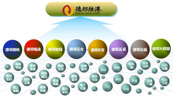 德鄰陸港平臺現有八大服務產品:分別是“德鄰暢途”、“德鄰智園”、“德鄰云倉”、“德鄰e寶”、“德鄰云采”、“德鄰云嘉”、“德鄰大數據”及“德鄰鋼鐵”。見圖1 。