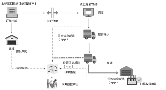 系統從承運商的調度、倉庫預約、司機到倉簽到、排隊叫號、提貨確認等相關節點信息全部來自云TMS;在途信息節點采集通過司機APP完成;此外,簽收環節通過電子圍欄自動記錄司機到收貨倉時間、同時系統記錄開始卸貨、卸貨完成以及離開時間等。