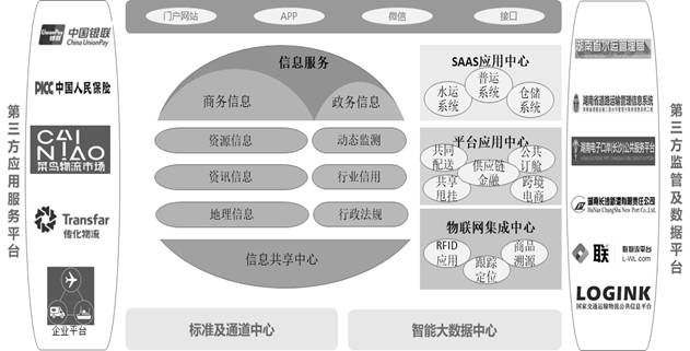 物流公共信息服務(wù)平臺(tái)是一個(gè)有機(jī)體,以標(biāo)準(zhǔn)和通道中心、智能大數(shù)據(jù)中心建設(shè)為主體。并以這兩大中心作為其他應(yīng)用服務(wù)的基礎(chǔ)性支撐,發(fā)揮公共平臺(tái)巨大整合效應(yīng)。