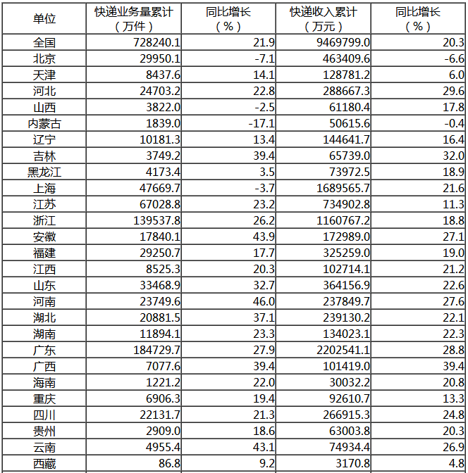 分省快遞服務(wù)企業(yè)業(yè)務(wù)量和業(yè)務(wù)收入情況表