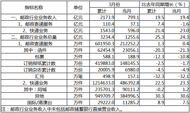 3月份,郵政服務業(yè)務總量完成206.9億元,同比增長15.5%;郵政寄遞服務業(yè)務量完成21.2億件,同比增長0.4%;郵政寄遞服務業(yè)務收入完成37.1億元,同比下降1.6%。