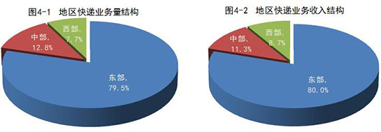 一季度,東、中、西部地區(qū)快遞業(yè)務量比重分別為79.5%、12.8%和7.7%,業(yè)務收入比重分別為80%、11.3%和8.7%。與去年同期相比,東部地區(qū)快遞業(yè)務量比重下降0.6個百分點,快遞業(yè)務收入比重基本持平;中部地區(qū)快遞業(yè)務量比重上升0.8個百分點, 快遞業(yè)務收入比重上升0.1個百分點;西部地區(qū)快遞業(yè)務量比重下降0.2個百分點,快遞業(yè)務收入比重下降0.1個百分點。