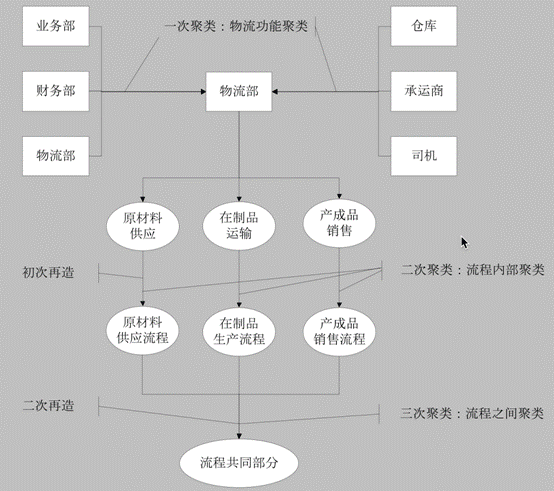 第三次聚類則發生于供、產、銷三個環節之間,即二次再造。聚類的目的是將三大流程間的相似之處進行聚類,盡量尋求三個流程的共同點,在這樣的共同點上,可以采用相同的業務流程,進行業務流程的標準化與信息化,如三大流程可以采取同樣的承運商選擇與出庫流程,這使得物流部業務在操作層面上更加簡單。