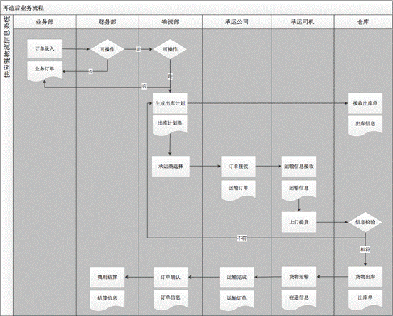 按照流程再造的思路和原則,為更好的改善當前業務流程存在問題,設計供應鏈物流管理信息系統,輔助流程再造的進行,整合供應物流、生產物流和銷售物流中的物流信息,對外部承運商、承運司機訂單完成情況進行監控管理,將原有NC系統、OA系統及表單大師系統功能進行整合,打破依靠郵件、電話溝通的傳統模式,實現數據的實時傳輸與企業內外部及部門間的信息共享及使用。