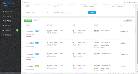 系統為業務部、財務部、物流部、承運商、倉庫提供PC端登陸方式,同時為承運商和司機提供IOS及android版本的APP手機客戶端,方便承運商隨時管理車輛、司機回傳電子運單等操作。