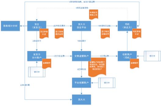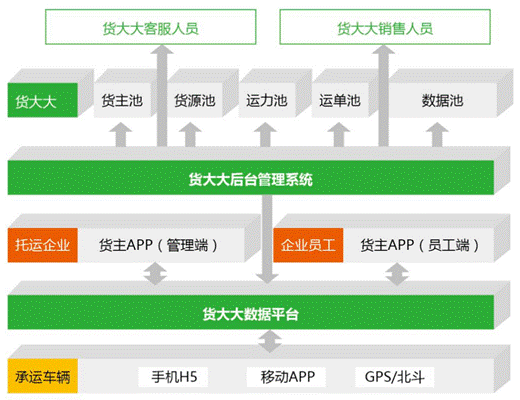 在基于無車承運(yùn)人的貨主和司機(jī)精細(xì)化管理的基礎(chǔ)上,貨大大為司機(jī)和貨主提供了運(yùn)輸業(yè)務(wù)一站式服務(wù),逐步建立和完善基于平臺的生態(tài)體系,如下圖所示。