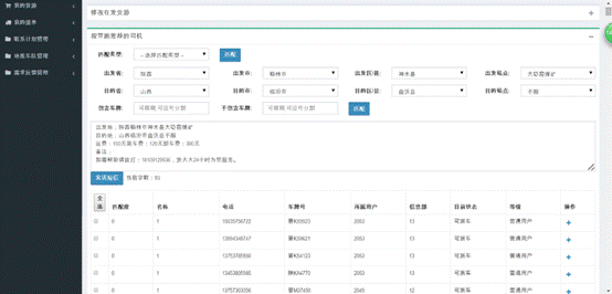 平臺綜合司機(jī)的常跑路線、運(yùn)輸習(xí)慣、拉貨周期、熟貨主等因素,有重點(diǎn)、有方向的給專線司機(jī)進(jìn)行貨源智能匹配,平臺可以通過貨源匹配司機(jī),也可以通過司機(jī)匹配到合適的貨源,快速地定位到合適的司機(jī),大大提升了找車的效率,如下圖所示: