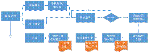 貨達(dá)物流與太平洋保險以及華泰保險實(shí)現(xiàn)了后臺借口打通,可以為所承運(yùn)的貨物進(jìn)行實(shí)時投保,為事故車輛提供7*24小時專業(yè)理賠服務(wù),保險公司確認(rèn)事故現(xiàn)場后24小時內(nèi)急速賠付,流程如下圖所示。