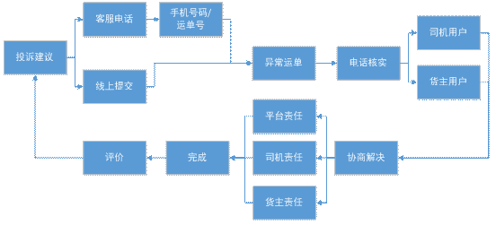 另外,針對貨物運(yùn)輸過程中發(fā)生的任何異常情況,貨達(dá)物流建立了一套投訴處理流程,用戶投訴處理快速響應(yīng),一般問題12小時內(nèi)急速解決,復(fù)雜問題48小時內(nèi)快速解決 ,處理完畢用戶在線評價,以保障對貨主和司機(jī)的服務(wù)質(zhì)量,如下圖所示。