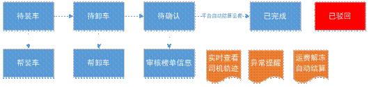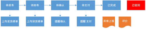 司機(jī)在線接單生成進(jìn)行中運(yùn)單記錄,貨主可實(shí)時查看、管理進(jìn)行中、已取消、已完成運(yùn)單,運(yùn)單狀態(tài)共分為四個:待裝車---待卸車---待確認(rèn)---已完成;