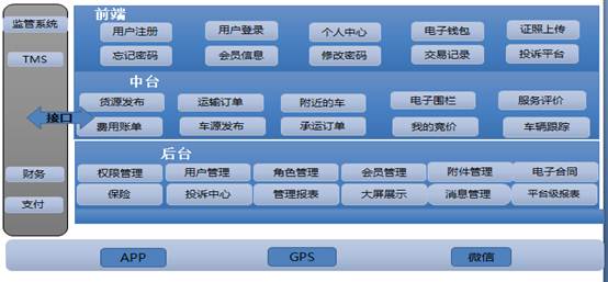 大恩物聯自2008年開始建立自己的運輸管理信息系統(TMS),用于夯實自身管理基礎,2015年開始升級改造并且建立倉庫管理信息系統(WMS),2016年隨著無車承運人試點工作的開始,繼續對運輸管理信息系統進行改造,同時建立了大恩的無車承運平臺,平臺架構如圖,平臺的主要功能如下: