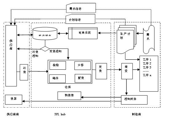 (5)制造商在生產線或者指定地點接受3PL配送的零部件和原材料時,對其進行檢查,然后通知財務部門與3PL和供應商進行財務結算。