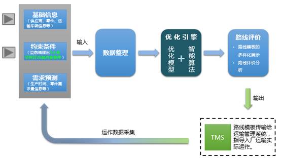 通過(guò)業(yè)務(wù)基礎(chǔ)信息以及業(yè)務(wù)規(guī)則的收集整理,以及零件的需求預(yù)測(cè),構(gòu)建優(yōu)化模型,并將收集到的數(shù)據(jù)轉(zhuǎn)化為系統(tǒng)所需模式,通過(guò)優(yōu)化引擎,采用智能算法,給出較優(yōu)的路線模板供業(yè)務(wù)人員使用。