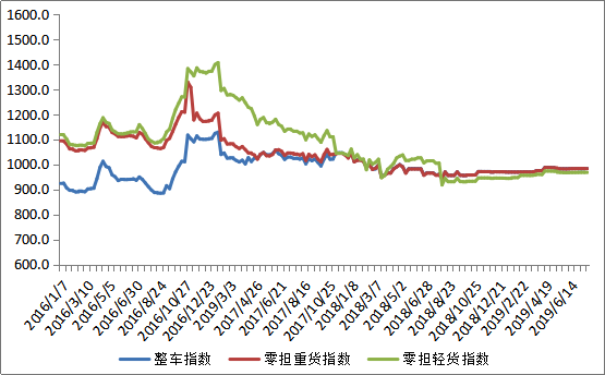 分車型看,各車型指數相對穩定,波動不大。其中,整車指數為983.96點,比上周回落0.01%;零擔輕貨和零擔重貨指數分別為968.48和983.78點,與上周基本持平。