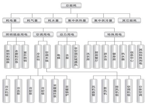 2) 分項原則:按建筑設施中不同用能系統進行分類采集和統計的能耗數據,如:空調用電、動力用電(電梯、水泵)、照明用電、特殊用電(機房、餐廳)等。