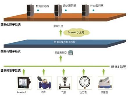 采集子系統作為數據采集終端,主要由分布在各能耗計量現場的智能電表、水表等組成,采用具有高可靠性、帶有現場總線連接的分布式I/O控制器構成數據采集終端,通過開放的通訊協議向數據中心上傳存儲的建筑能耗數據;測量儀表擔負著最基層的數據采集任務,其監測的能耗數據必須完整、準確并實時傳送至數據中心。