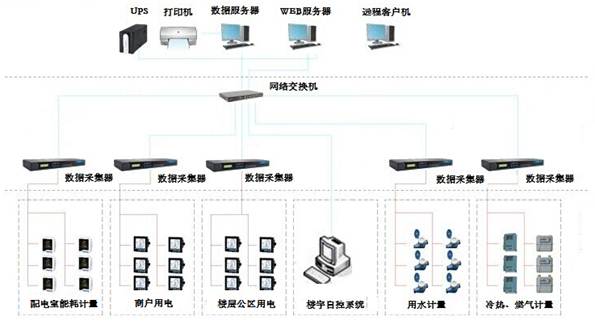 系統采用 “站控管理層——網絡通訊層——現場設備層”的分層分布式設計,站控管理層設置于建筑配電監控室內,其設備包括安裝有能源管理系統軟件的數據服務器、WEB服務器和客戶瀏覽機、顯示器、UPS電源、打印機等,負責對能耗數據進行集中處理;網絡通訊層由網絡交換機、數據采集器及網絡通訊線組成,負責與建筑其它子系統及現場設備層的各類儀表裝置進行通訊;現場設備層是各級能耗設備計量儀表,如建筑配電室計量儀表、樓層計量儀表、租戶計量儀表、餐廳用水計量儀表、餐廳燃氣表、暖通系統冷熱量表等。