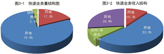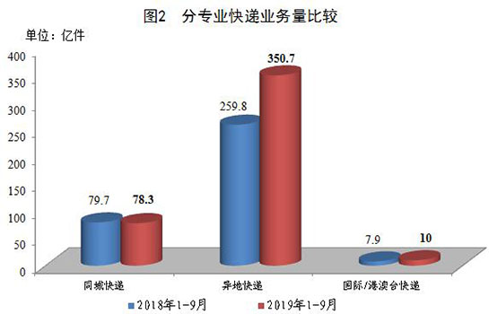 1-9月,同城、異地、國際/港澳臺快遞業務量分別占全部快遞業務量的17.8%、79.9%和2.3%;業務收入分別占全部快遞收入的10.3%、53%和9.9%。與去年同期相比,同城快遞業務量的比重下降5.1個百分點,異地快遞業務量的比重上升5.1個百分點,國際/港澳臺業務量的比重基本持平。
