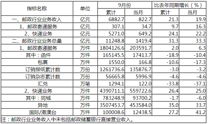 9月份,全行業業務收入完成822.7億元,同比增長19.9%;業務總量完成1419.4億元,同比增長33.3%。
