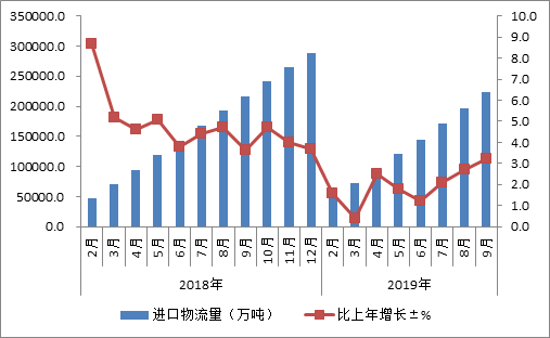 進口物流量增速小幅回暖。前三季度進口物流量同比增長3.2%,增速比上半年提高2個百分點。受到中美經貿摩擦的不確定性影響,今年以來國際物流需求波動頻繁。進入9月,在內需等相關因素帶動下,大宗商品進口需求仍處于高位,同時消費品進口也保持快速增長。不同貨類看,原油、煤等大宗商品進口量增加,水果、化妝品、水海產品和豬肉等消費品進口量幅度較大。前三季度,原油比上年同期增長9.7%;煤比上年同期增長9.5%;消費品比上年同期進口增長15.3%,其中進口豬肉增長43.6%;進口牛肉增長53.4%。