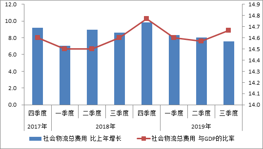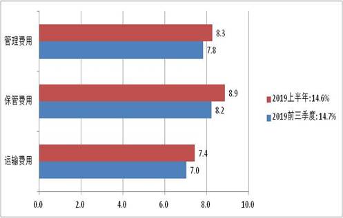 前三季度,社會物流總費用與GDP的比率為14.7%,盡管比2018年全年回落0.1個百分點,但比上年同期、今年上半年均提高0.1個百分點。2017年之前,這一比率連續5年下降,2018-2019年出現反復,這不改變在產業、經濟、政策等綜合作用下物流效率改善的基本趨勢,但從近期情況看,物流成本水平的上升與物流運行的微觀環境惡化及經濟運行過程中保管環節成本提高有較大關系。