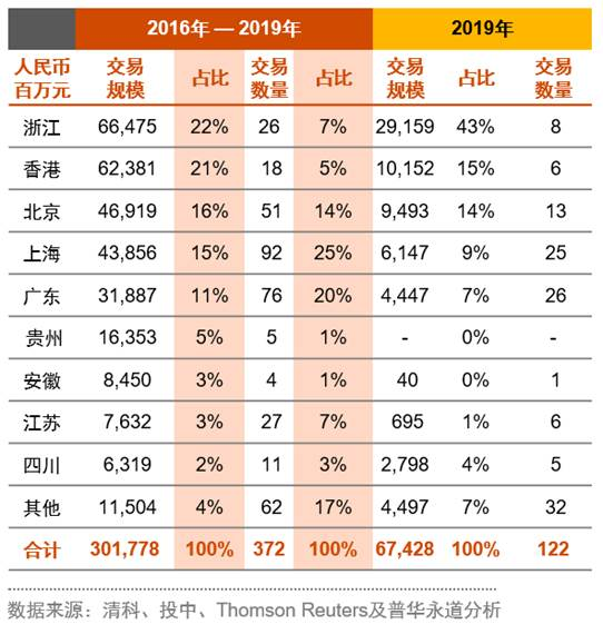 浙江、香港、北京、上海及廣東等地是熱點并購交易區域。