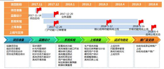 系統實施主要分項目準備階段,業務藍圖設計、系統實現、上線準備、試點與優化、推廣及支持幾個階段。實施完成后主要形成如下功能:訂單管理、空運運輸管理、汽運運輸管理、回單管理、計費管理、應收應付、企業門戶、內容管理、客服管理、輔助管理、主數據等。