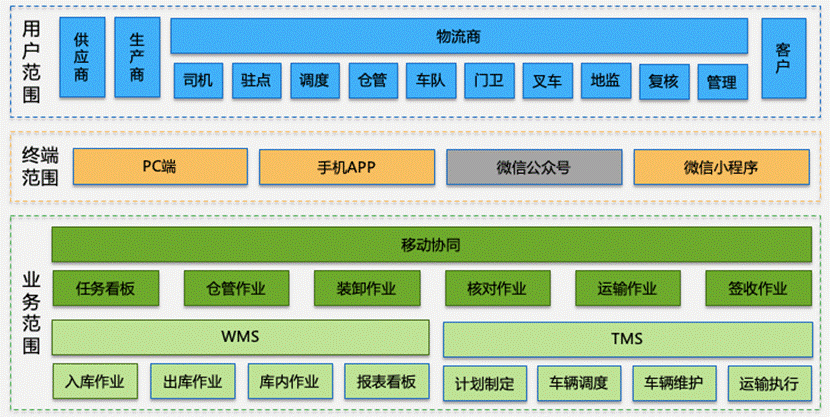 隨著工業4.0時代的到來,社會對制造業、服務業要求起來越高,精細化管理是公司未來提高竟爭力的主要方向之一,隨著移動互聯網的高速發展,移動端的市場占有率遠超PC端,這也預示著移動時代開始“火”起來,移動端的便捷性跟普遍性形成了不可替代的優勢,抓住信息技術的主流,使用移動端替代PC作業,優化公司流程,進行精細化管理,提升服務水平,對公司而言具有重大意義。同時,隨著業務量不斷增加,現存的WMS與TMS已經無法滿足業務部門的需求,在系統數據的連貫性、任務通知的即時性、剩余倉位管理的準確性、作業人員工作的高效性等方面,業務部分均提出了迫切需求,希望通過更現代化的IT系統來輔助業務流程及管理流程的升級。基于此項目的,開始進行物流移動辦公平臺的建設,主要解決數據采集、工作任務清晰、工作任務及時分配和工作任務看板可視化的問題。