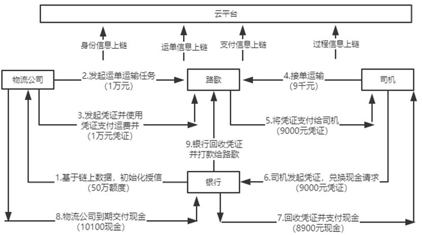 在保證與實際業務流程一致情況下,路歌平臺連接拓佳物流公司和網商銀行,把數據上鏈,實現真實業務資金流程;背后的區塊鏈過程底層化。