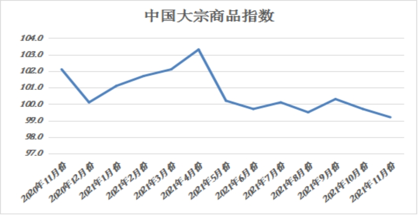 由中國物流與采購聯合會調查、發布的2021年11月份中國大宗商品指數為99.2%,連續兩個月下跌,跌至自2020年2月份以來的最低水平,市場持續下行探底。各分項指數中,供應指數五連跌至二十一個月的最低,銷售指數兩連跌至9月份以來的最低水平,庫存指數止跌反彈至近三個月的最高。從本月指數的變化情況來看,隨著天氣轉冷、環保限產全面推進以及疫情反復,給供需兩側均帶來影響,特別是淡季來臨令市場需求縮減更加明顯,前期市場剛剛建立的供需緊平衡的局面被打破,市場供大于求的跡象顯現,商品庫存開始積壓。從當前大宗商品市場的驅動因素來看,市場正面臨多空博弈,影響因素包括國內經濟運行趨穩、短期供應下降、庫存回升緩慢的利多,以及隨著消費淡季深入、中期在地產下行和滯脹背景下的需求放緩,加之流動性見頂以及美元上行帶來金融溢價的擠出,整體來看,后期市場的下行風險正在持續累積,商品價格重心預計將進一步下移。