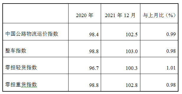 表1 2021年12月中國公路物流運(yùn)價指數(shù)表